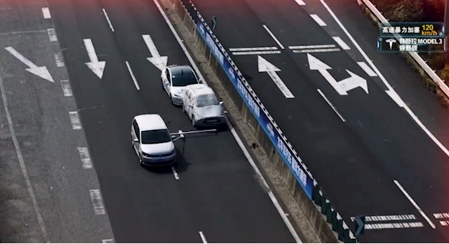 特斯拉Model 3固然有防备肠驾驶,但刹车时机太晚,终末全力刹车后,以53km/h追尾加塞前车。