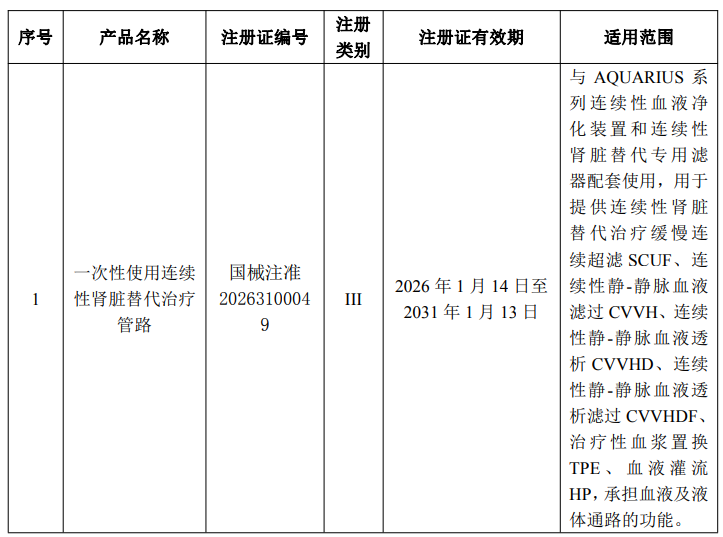 该产物由多种管路和附件构成,适用于与AQUARIUS系列归拢性血液净化安设和专用滤器配套使用,承担血液及液体通路的功能。这次注册证的取得,记号着公司产物捏续适应相干监管条目,有助于自如和扩大商场竞争力。