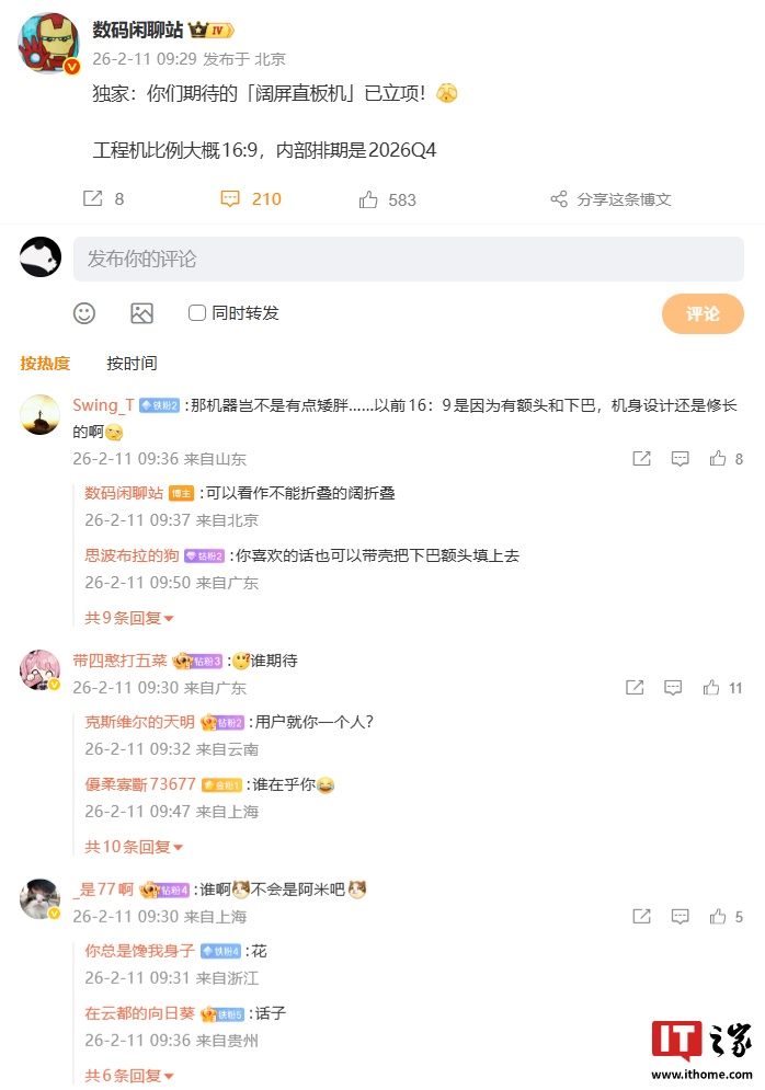 IT之家 2 月 11 日音问,博主 @数码闲道站 当天发文夸耀,人人期待的「阔屏直板机」已立项云开体育,工程机比例好像 16:9,里面排期是 2026 年 Q4。荟萃驳倒区磋商来看,该机预测包摄华为品牌。