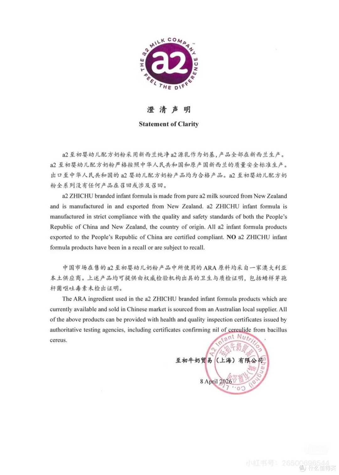 第三方检测讲演可查除了 a2 官方的公开讲明,第三方检测信息为这条 ARA 着手口径提供了外部考据。据 a2 官方讲明,有关居品可提供巨擘检测机构出具的卫生与质料检测解释。