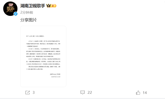 @湖南卫视歌手 发文称