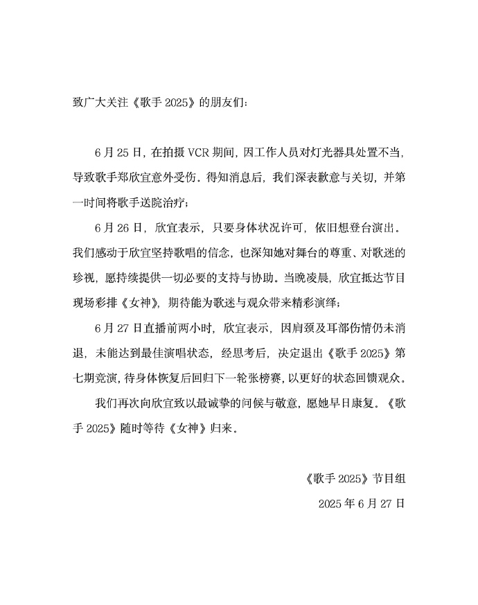 6月25日,在拍摄VCR技能,因使命主谈主员对灯光工具处治不当导致歌手郑欣宜有时受伤,得厚交尘后,咱们深表歉意与贵重,并第一时辰将歌手送院养息。