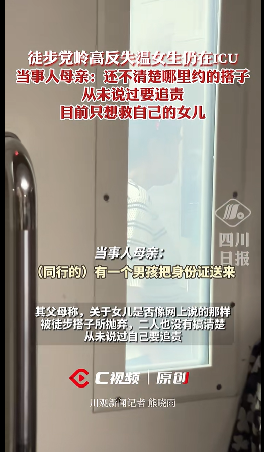 10月10日,据川不雅新闻音讯:徒步党岭高反失温女生父母恢复记者称,刻下犬子手术后尚未知道,情景较昨晚自如,但医师请示,病情仍处变化阶段,不摈斥植物东谈主风险,是否进行二次手术还需进一步不雅察。