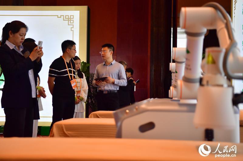 江西中医药大学使命主说念主员向参不雅者先容热敏灸机器东说念主的使用门径。东说念主民网记者 时雨摄